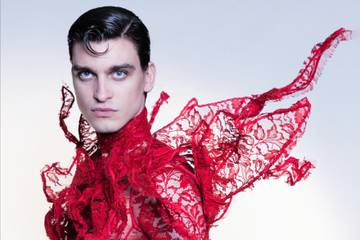 Tailoring (rideaux de velours de théâtre revisités en maillots techniques, trench coat, costume croisé), dentelles (Sophie Hallette), broderies moirées ou de flammes réalisées en Inde, plumes (Maison Février), vêtements au tricot, l’univers de ce créateur, accueilli plusieurs fois sur le showroom Sphère de la FHCM, s’inscrit définitivement dans un néo dandysme chic et fougueux.