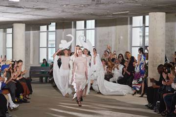 La première partie, exclusivement blanche avec de grands chapeaux en forme de cygne, symbolise "la recherche". Dans la deuxième, on retrouve couleurs, imprimés, fleurs et grands volumes. Avant de conclure sur "quelque chose de sophistiqué et mature, plus construit et structuré", tout en noir.