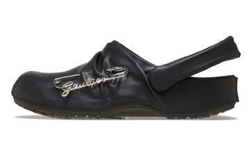 La JPG x Crocs Classic Clog noire (photo d'ouverture), en PU drapé, comprend une épingle à nourrice argentée avec l'inscription Gaultier, typique de la touche punk de la marque de luxe . Elle est fixée sur le pied gauche. Cette ornementation fait office de charms.