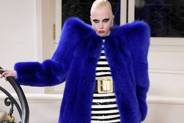 Les ceintures, larges, accentuent encore le côté filiforme des mannequins. Les hauts sont souvent asymétriques, avec une seule bretelle. Les jupes sont droites ou "suspendues", comme des tutus à bouillons. Les épaules démesurées d'un manteau de fourrure bleu Klein forment deux ailes pour ces oiseaux de nuit à l'oeil charbonneux, la bouche rouge et les cheveux plaqués en arrière, des collants noirs fins et des escarpins de couleur vive. Un manteau évoquant celui de la fameuse collection 1971 d'Yves Saint Laurent, qui avait fait scandale en s'inspirant de la mode des années d'Occupation.