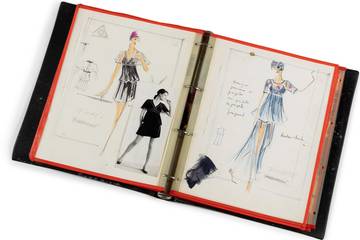 Un des lots les plus attendus sera sans doute l’ensemble comprenant vingt-quatre croquis datant de 1969, réunis dans un classeur avec trois articles de presse publiés sur Karl Lagerfeld cette même année, et des montages qu’il faisait pour ses inspirations (estimation 3 000 - 5 000 euros). Certains portent des annotations de Karl Lagerfeld lui-même, qui sont des recommandations ou des titres comme ce dessin au feutre bleu, illustré d’un ensemble jupe et haut sur lequel est écrit le mot « jupe » et celui à l’encre, titré « The age of destruction » (estimations 1200 – 1 800 euros).