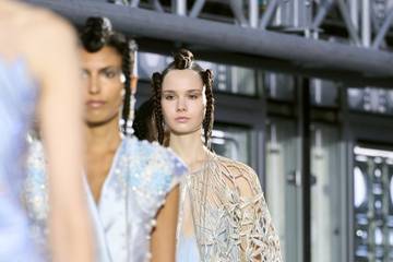 Robes longues aux jupes légères et aux bustes ornés de broderies ciselées, formant comme une guipure, robe en soie aux motifs nuages, bustier en forme de pétales, caftans transparents... La couturière de 42 ans livre une collection qu'elle décrit comme "cosmique", dans une palette de bleus pour la plupart très éthérés.
