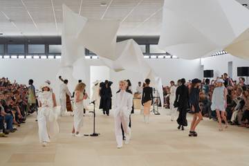 Les gigantesques chapeaux des looks monochromes bougent comme le décor en papier plissé apportant au défilé une dimension onirique.