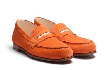 Pour l’été 2023, l’espadrille « Wait and Sea » se décline en veau velours ou en veau lisse avec des coutures couleur terre battue. Ce modèle est entièrement assemblé à la main. Quant à l’emblématique mocassin, il revêt une allure plus formelle. Réalisé en nubuck orange et rehaussé d’une bride en forme de mouette et de coutures blanches, il rend hommage à la noblesse du tennis.