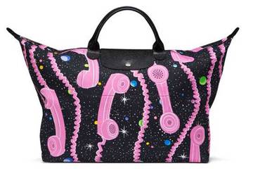 Le fameux sac « Pliage » de Longchamp s’habille aux couleurs de Jeremy Scott avec des imprimés pop, graphiques et intergalactiques et prend le nom de « Long Distance Call ».