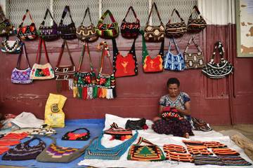 Penchée sur son ouvrage, elle entrelace avec dextérité des fibres végétales pour donner vie à ces larges sacs qui supportent aussi bien le poids d'un enfant que de lourdes provisions.