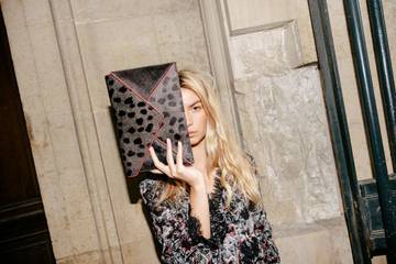 Trois articles seulement composent cette mini-collaboration en édition limitée : une robe fluide et près du corps à manches longues et col V (120 euros), une paire de mules à petits talons (130 euros) et une pochette enveloppe au motif animalier (80 euros).