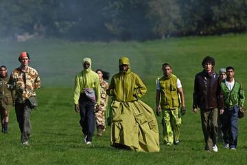 Investissant une prairie, les mannequins ont avancé en groupe, prêts à affronter les éléments, veste multipoches à imprimé camouflage ou capuche repliée sur la tête, dans un nuage de fumée.