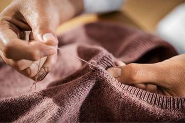 La marque réutilise sa maille débordante en pur cachemire cardé (fibres aérées) : toutes les coutures, fermetures à glissière ou fermetures sont méticuleusement enlevées à la main et le tissu est divisé en catégories de couleurs, lavé, défait et décomposé en produits secondaires de filature, puis mélangé avec du cachemire vierge non teint pour créer un mélange de la même qualité et de la même valeur que le cachemire neuf (pourcentage de matières recyclées non communiqué).
