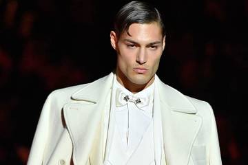Dans le vestiaire "chic et sobre" de D&G l'hiver prochain, on trouve des redingotes et smokings noirs, un ensemble blanc avec noeud papillon, des longs manteaux en laine, des pantalons à pinces avec motif prince de galles... Mais la maison ne renonce pas pour autant à son ADN. L'homme D&G aime aussi les vestes ou manteaux en style peignoir, les ensembles en velours (violet pétant, marron-orangé...) et les pulls ou manteaux en strass.