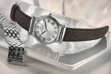 Equipé d'un système simple, le bracelet interchangeable de ce garde-temps se révèle être un atout. Car pour le remplacer, il suffit de le glisser entre les cornes du boîtier puis de "clipper". Michel Herbelin propose d'ailleurs un éventail de trente coloris et matières de bracelet, simple ou double tour, pour une montre qui se transforme aux gré des envies des clientes... en quelques secondes.