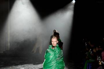 Le sol de la salle où s'est déroulé le défilé, au Palais de Tokyo à Paris, évoquait une décharge de vêtements à ciel ouvert. Des tenues noires portées avec des bottes à grosses semelles ont ouvert le défilé.