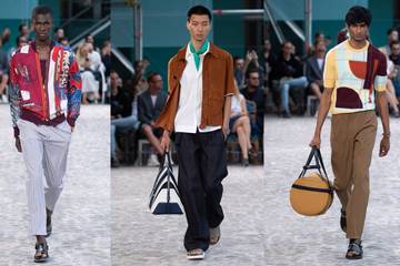 Nombre d'entre eux ont porté un foulard de couleur vive unie au cou, alors que des carrés, en version originale ou surteints, ont été réinterprétés en compositions décomplexées sur des vestes et des chemises. La nonchalance estivale se traduit en coupes amples, matières fluides et couleurs toniques - menthe, prune, rose bubble gum - qui viennent raviver sable, rouille ou tabac.