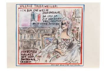 Parmi les pièces phares du catalogue figurent notamment des caricatures dessinées par Karl Lagerfeld, comme celles de l'ex-chancelière allemande Angela Merkel, de l'ancienne ministre française Roselyne Bachelot ou encore de la journaliste et ancienne compagne de François Hollande Valérie Trierweiler. Cette dernière y est représentée devant l'Elysée, habillée d'une robe de cour et déclarant: "Je suis la dernière Pompadour", en référence à la maîtresse du roi Louis XV, l'ex-première dame n'étant pas mariée avec le président de la République de l'époque.