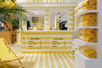 Réparti sur 40 mètres carrés, le pop-up store de l’enseigne Jimmy Fairly joue la carte de la thématique italienne et de ses plages ensoleillées. Dans un décor aux rayures jaunes et blanches, le stand éphémère propose aux visiteurs, en plus des lunettes et accessoires, des glaces fruitées en collaboration avec le glacier Glazed.