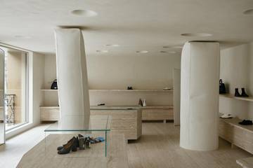 Célèbre pour son blanc signature, la maison Margiela a introduit en 2020 un concept retail dominé par la teinte naturelle du plâtre tout en jouant sur la texture du tissu, comme une invitation au toucher – décor imaginé avec l'architecte hollandaise Anne Holtrop.
