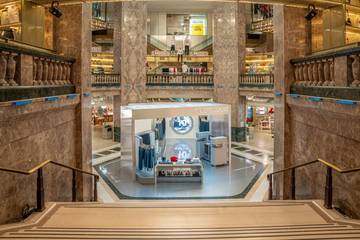 Après une première installation aux Galeries Lafayette Haussmann, Guess Jean se tourne vers les Galeries Lafayette Champs-Élysées pour l’été 2024. Le point de vente éphémère prend ses quartiers dans l’atrium principal et le tunnel d’entrée du grand magasin parisien.