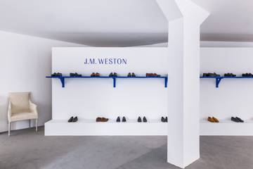 L’intérieur de cette boutique est composé de deux espaces. Dans le premier, deux angles érigés dès l’entrée présentent le savoir-faire de la maison et ses modèles emblématiques. À l’arrière de cet espace, un grand mur bleu, couleur inspiré des émaux de Limoges, ville où la marque a vu le jour. Sur ce mur, sont présentés tous les modèles de J.M. Weston, pour homme ou femme. Le second espace est un petit salon exclusivement dédié à la collection femme.
