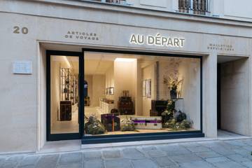La décoration renouvelée du magasin juxtapose béton brut, accessoires en marbre et détails en laiton. Alors que le rez-de-chaussée est consacré à la maroquinerie d'Au Départ et à ses archives, la vitrine et le premier étage sont dédiés à la nouvelle branche culturelle de la marque, « Au Départ Art Collective ».