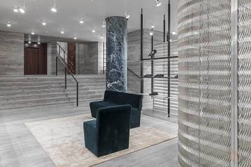 L’ambition de la maison italienne de faire une transition entre les deux époques Brioni s’exprime par des matériaux classiques tels que les sols et les murs gris en travertin, référence à la Rome antique, et des éléments plus modernes comme une série de cloisons en treillis métallique transparent qui ouvrent l’espace de 590 mètres carrés, se déployant sur deux niveaux.
