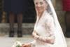 La tenue du grand jour de cette jeune femme issue des classes moyennes devenue duchesse de Cambridge était complétée par une traîne plutôt discrète de deux mètres 70, retenue par un diadème de diamants signé Cartier (de 1936) pretée par la Reine Elisabeth II d'Angleterre. La princesse royale a également choisi de porter une longue voile très légère en tulle de soie, des chaussures en satin ivoire et un bouquet de muguet.