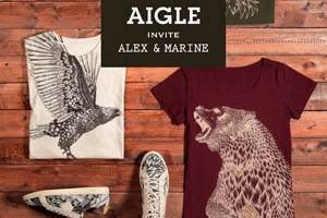 La collection automne-hiver 2014 de Aigle s'ouvre avec les deux artistes Alex & Marine. "A&M", c'est quatre mains, deux cerveaux et beaucoup de talent: ces graphistes realisent d'imposantes fresques entièrement à la main. Ils tatouent les murs en y mêlant géométrie et graphisme pointilleux, ont fait de l'animal leur thème de prédilection. Ils sont notamment attirés par les plumes et les poils qu'ils subliment volontiers dans leurs oeuvres.