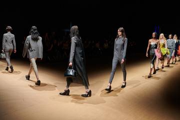 In a statement Prada said its day and evening wear cross-pollinate. "The signs and signifiers of each shifting - opera coats fuse with leather jackets, tailoring borrows trains of fabric. Clothes for the intimacy of the home in delicate pastel tones fuse with outerwear, a blurring of distinct realities, while a notion of Prada uniform, in bodysuits of poplin shirting in industrial colors, denotes a minimalized reality."