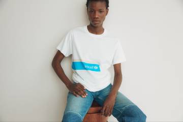 The UNICEF capsule includes a white T-shirt and sweatshirt made from 100 percent deadstock or leftover materials, featuring the cyan blue UNICEF logo. This marks the first time a fashion house has been able to include the official UNICEF logo on its products.