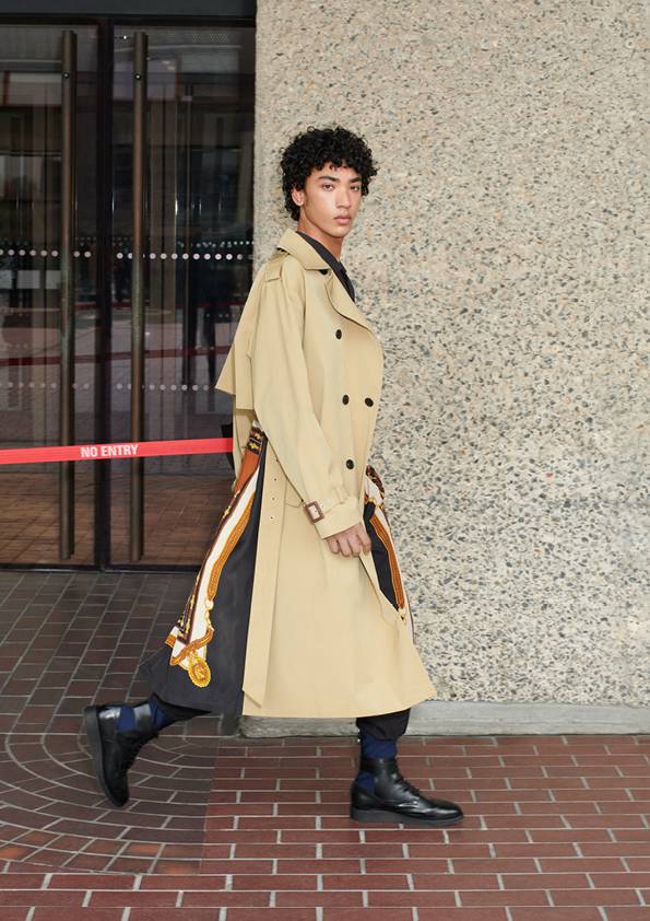 Meanwhile, the menswear includes eye-catching scarf prints that appear in reversible bomber jackets, on loungewear, and on a hybridized trench coat, alongside reworked sweaters and shirts.