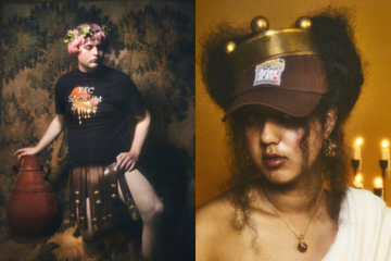 The statement piece from the collection is a distressed leather jacket in deep gravy brown for 1,400 pounds, finished with a Renaissance-inspired back panel with celestial figures presenting chicken drumsticks like prized treasures. Each jacket is also finished with a co-branded gold foil logo and a hand-applied gold drip effect, making every piece one-of-a-kind piece.