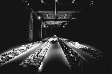 Kirkum said she wanted to use the presentation to share insight into the production process and set the scene from their biweekly warehouse trips to source their upcycled materials. The result was four twenty-metre rows displaying 824 single shoes collected from a recycling centre in London.
