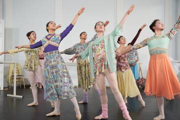 For the clothes, highlights included sporty sweatshirt-style jumpers showcasing Tata Naka’s interpretation of Giselle, Romeo and Juliet and The Swan ballet posters, alongside vintage-style florals often seen on leotard designs used on cut-out dresses in various colourways and adorning soft cashmere pieces.