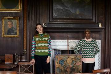 ‘Postcards from the Castle’ features jumpers, cardigans, knitted vests and polo shirts, alongside trays and posters that evoke vignettes of medieval castles and ancient botanical gardens.