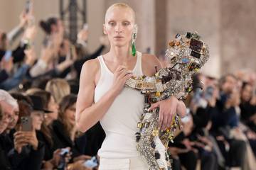 Transforming tech discards such as old phones and motherboards into a modern-day aesthetic, Roseberry's creation also pays homage to Elsa's fascination with astrology. During a preview, Roseberry revealed that the robot baby featured on the catwalk is an ode to the film "Alien," which starred Sigourney Weaver.