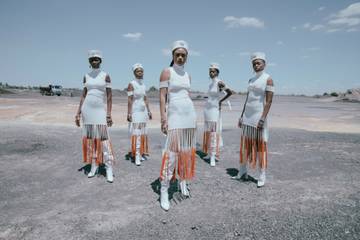 In a statement, Magugu said: "For this collection, I thought about national identity politics, and how western influence has penetrated indigenous dress. Often, I see a woman in downtown Johannesburg wearing a shweshwe wrap skirt, a fabric often worn for traditional ceremonies, but paired with a Vodaphone or Manchester United tee.