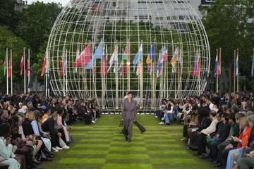 A global, multicultural mindset was evident at Louis Vuitton as flags of the world flew over the La Maison de l'UNESCO rooftop runway. Travel attire spanned the daily commute to far flung destinations with pilot-inspired outerwear, city tailoring, and adventure-led sportswear teamed with luxury carry on cases, and aviator shades. Soft tracksuits and buttery leathers offered jet-setting comfort. Neutral shades reflecting the range of human skin tones were joined by a colorful snake-meets-camo geo print produced in collaboration with Air Afrique, a cultural platform dedicated to Afro-diasporic arts.