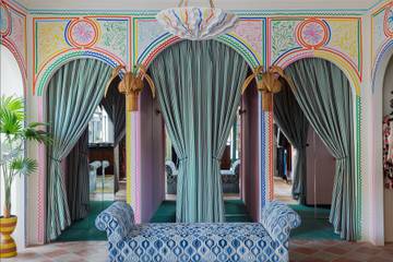 Rixo also ensured its fitting rooms are similar to its flagship by commissioning Colours of Arley to create bespoke stripe curtains in pickle green and flora pink mini stripe, made from 100 percent recycled bottles. The floor in the space is a Ca Pietra chequerboard tile in terracotta and neutral, and a yellow zig zag stripe wallpaper from Salvesen Graham lines the walls.